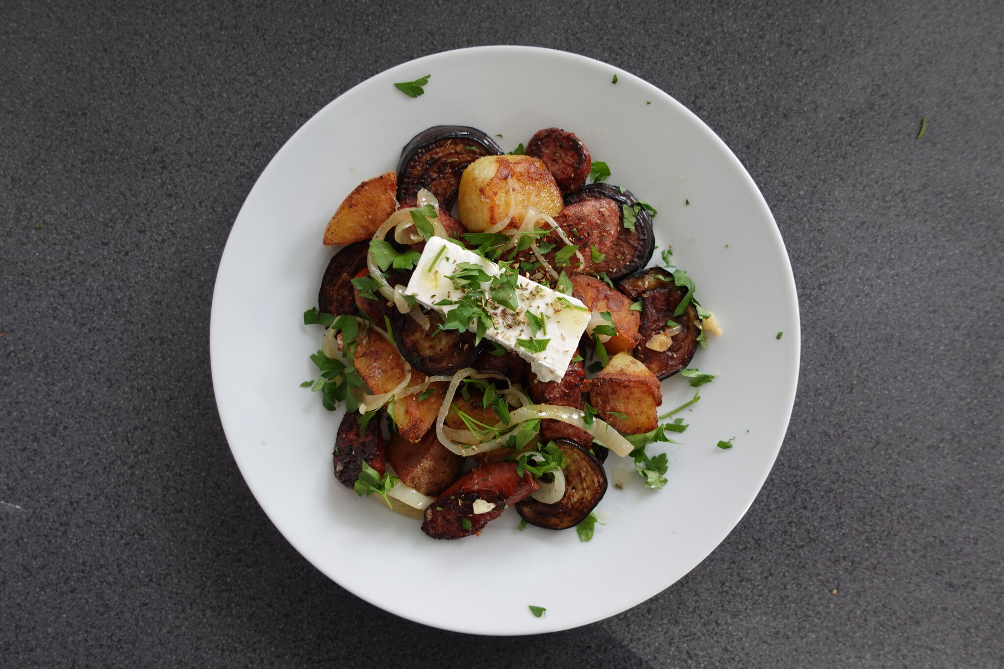 ’s Avonds genieten we van live muziek en van… aardappelen met worst, aubergine en feta. Dat moest nu eenmaal van Andreas. Deze eenvoudige schotel is juist zo lekker door de pure smaken!