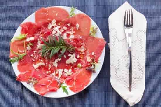 3. Laat de carpaccio circa 30 minuten ontdooien op kamertemperatuur.