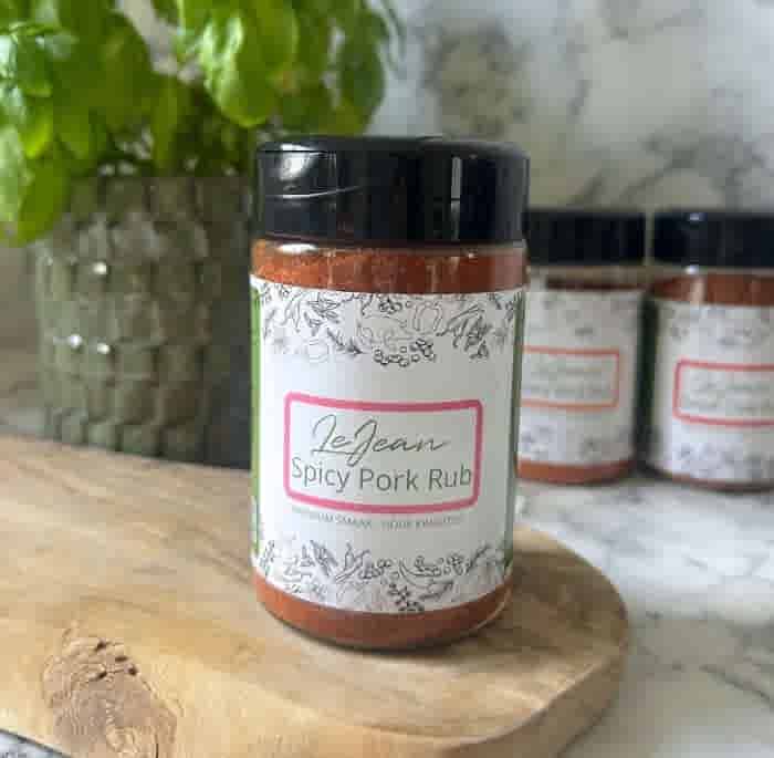 De Spicy Pork Rub van LeJean bevat de volgende ingrediënten: zeezout, donkere basterd suiker, paprikapoeder, gerookte paprikapoeder, gemalen komijn, knoflookgranulaat, gemalen MOSTERDZAAD, gemalen zwarte peper, gemalen chili, rozemarijn en oregano.